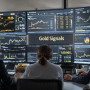 Trading office with analysts monitoring gold price signals on screens